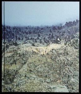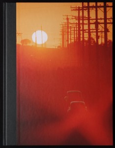 Was für ein Buch! Außen ist eine Straße zu sehen, die in Richtung Sonnenuntergang führt und von vielen Telegrafenmasten begleitet ist. Das starke Teleobjektiv lässt die Masten als Wald und die Sonne als riesige Scheibe erscheinen.