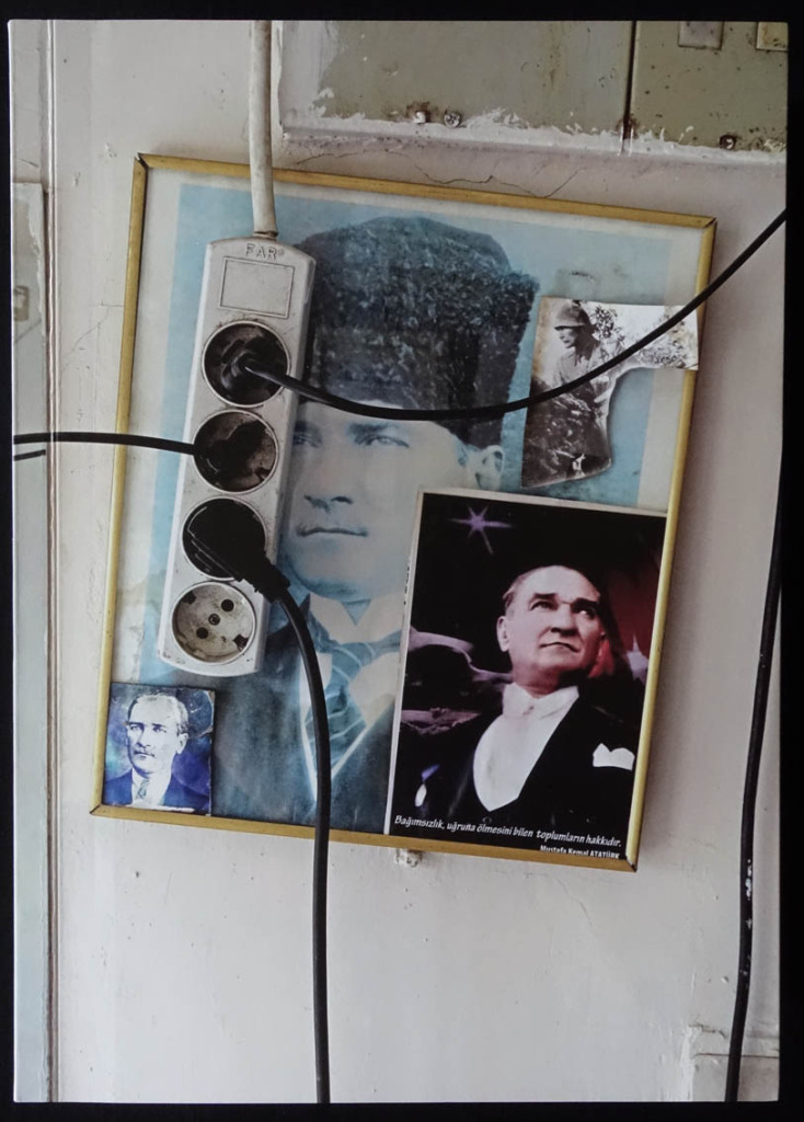 Die Türkei verdankt ihrem Präsidenten Mustafa Kemal Atatürk (1881-1938) viel, sodass das Gedenken an den Neuerer noch immer sehr präsent ist. Die Fotografin Mine Dal (Jg. 1960) reiste durch auf der Suche nach Spuren von Atatürk das Land und fand viele davon: gemalte, fotografierte und genähte Bilder, Skulpturen, Plakate und sonstige Memorabilien, an öffentlichen Gebäuden, Bars, Friseursalons, Läden, am Straßenrand oder gar auf T-Shirts. Atatürk ist dabei recht vielgestaltig und nicht immer leicht zu erkennen, offenbar fehlt eine ikonische Abbildung wie die von Che Guevara, die auf ein Foto von Aberto Corda zurückging und die Che weltberühmt machte. Zwei lose beiliegende Reproduktionen des Politikers in Zylinder bzw. Pelzmütze zeigen nicht nur mögliche Vorlagen, sondern könnten ihrerseits auch wieder als Bild irgendwo platziert werden.