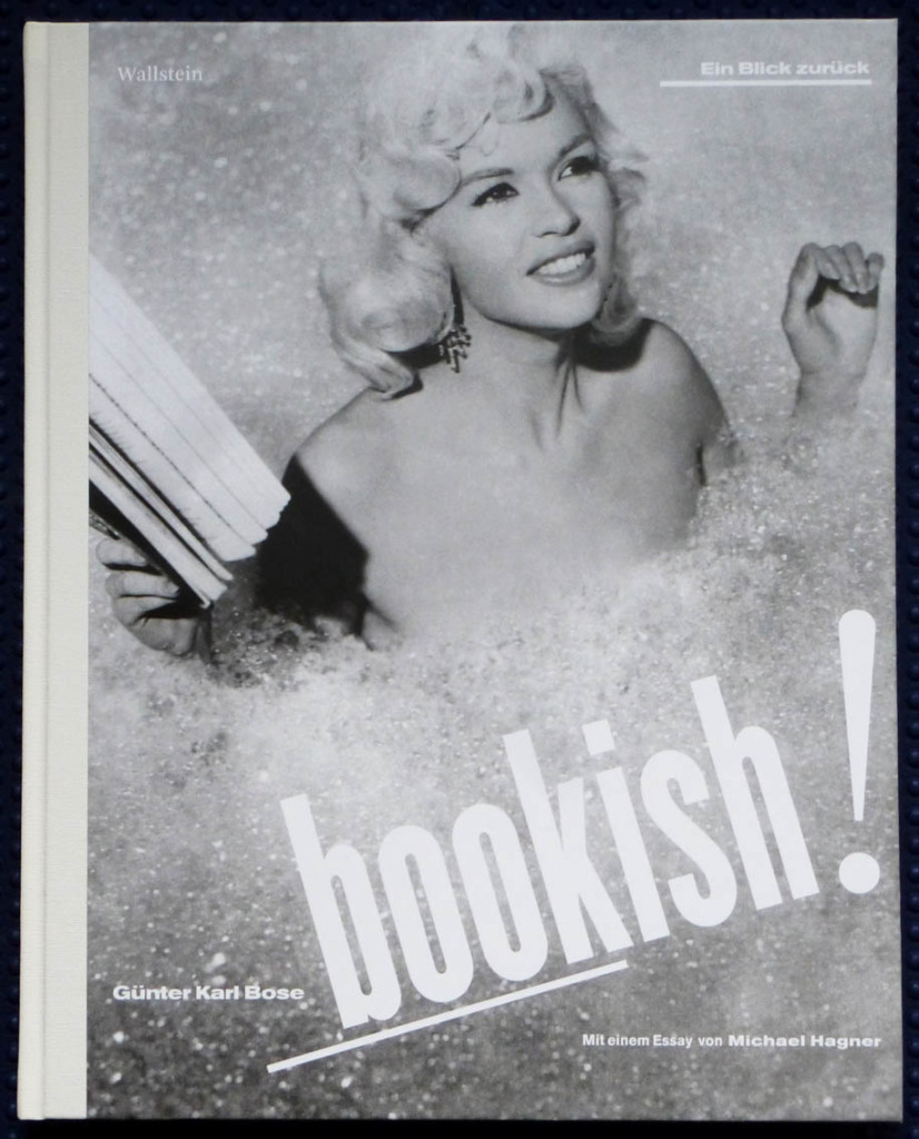 Zwischen diesen beiden Fotos aber, die sinnbildlich für die Verkleinerung der Speichermedien stehen, hat Günter Karl Bose eine faszinierende fotografische Kulturgeschichte des Buches im Spiegel seines Gebrauchs zusammengetragen. Ich sage bewusst „Gebrauch“, denn „Gebrauch“ meint mehr als „Lesen“. Wirkliche Leser, Leute also, die in die Lektüre versunken sind, finden sich erstaunlicherweise selten. Andererseits: Mit Büchern lässt sich nun ja auch viel mehr anstellen als schnöde Lektüre. Ein Buch ist mehr als ein Text auf Papier zwischen zwei Pappdeckeln, das wird deutlich. Bücher sind Accessoires und Fetische. Sie sind winzig klein und riesengroß, schöne Nebensache, wichtig und hoch bedeutsam gar wie Bibel und Mao-Bibel. Immerhin gelegentlich werden sie gelesen, nicht nur von Menschen, sondern auch von Maschinen. Man stützt sich auf ihnen ab, versinkt mit ihnen im Schaumbad (wie die Sex-Ikone Jane Mansfield). Man schaut versonnen über den Buchrand in die Ferne oder posiert vor Bücherwänden (mal mehr mal weniger oder gar nicht bekleidet). Bücher werden stolz präsentiert, befingert, gesammelt, geschleppt, verbrannt, gestapelt, hochgehalten (und wieder: die Mao-Bibel). Bücher werden aufbewahrt in Bibliotheken und Buchmöbeln und feilgeboten in Book-Stores und Basars.