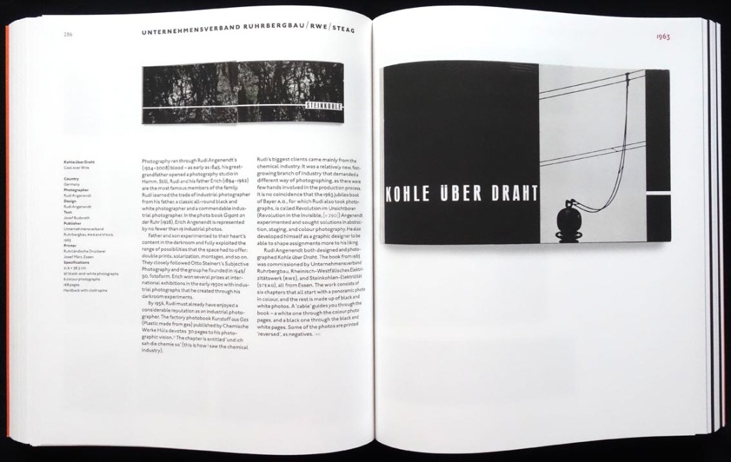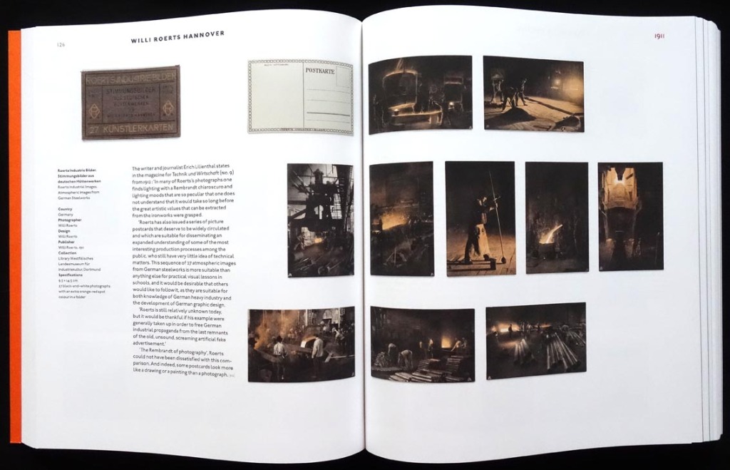 Sorgedrager gliederte sein Werk in neun Kapitel, denen jeweils ein einleitendes Essay vorangestellt wurde. Anschließend werden dann etliche Bücher auf einer oder zwei Doppelseite(n) in Wort und Bild präsentiert, wobei für die Katalogtexte der Schwerpunkt mehr auf ein Kurzporträt der Firmen und weniger auf die Form und Geschichte der betreffenden Publikation gelegt wurde. Es geht nicht nur um Bücher, sondern auch um andere Spielarten gedruckter Fotografie: eine Art Best-of als Einstieg, die Bücher des bislang unbeachteten Fotobuchpioniers Willi Roerts, Drucksachen als Souvenirs für Firmenbesucher, Firmenbücher aus der Produktion der Druckerei Draeger Frères, Bücher aus der Eisen- und Stahlindustrie, Firmenbücher bekannter Fotografen, Werbeobjekte mit Fotos (Leporellos, Stereokarten etc.), dann eine kleine Auswahl klassischer oder unbekannter niederländischer Firmenbücher und zuletzt reiht sich der in seinem Schaffen auf Darstellungen von (noch) produzierenden bzw. kurz vor der Schließung stehenden Fabriken spezialisierte Fotograf Sorgedrager mit seinen eigenen Büchern ein, was sowohl für Selbstbewusstsein als auch für die Qualität seiner Arbeit spricht. Eine ausfaltbare Chronologie, ein Anmerkungsapparat und ein Register runden das Buch ab. Dessen Gestaltung gibt jeder vorgestellten Publikation genügend Raum, sodass das Lesen und Entdecken nicht ermüdet und wirklich Spaß macht.