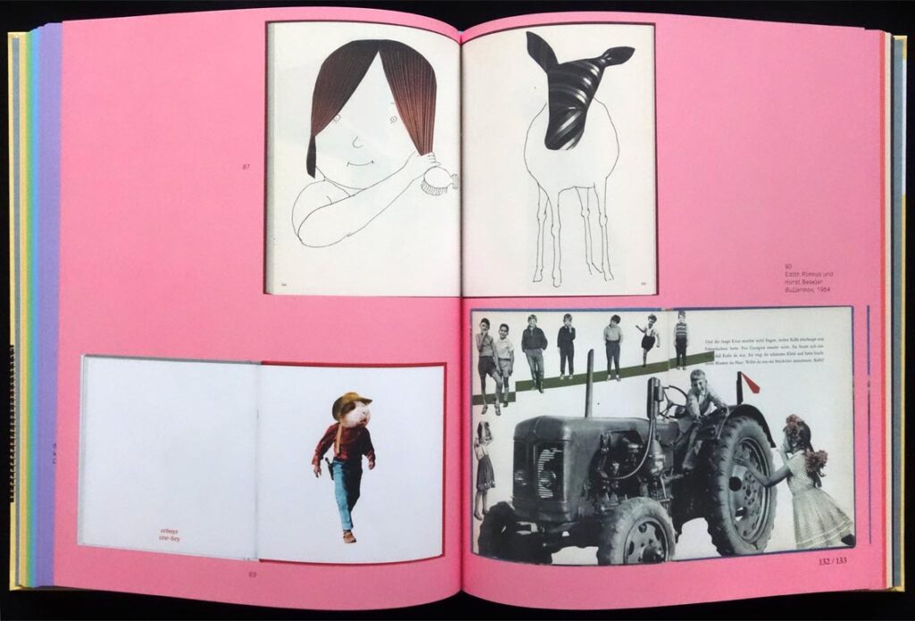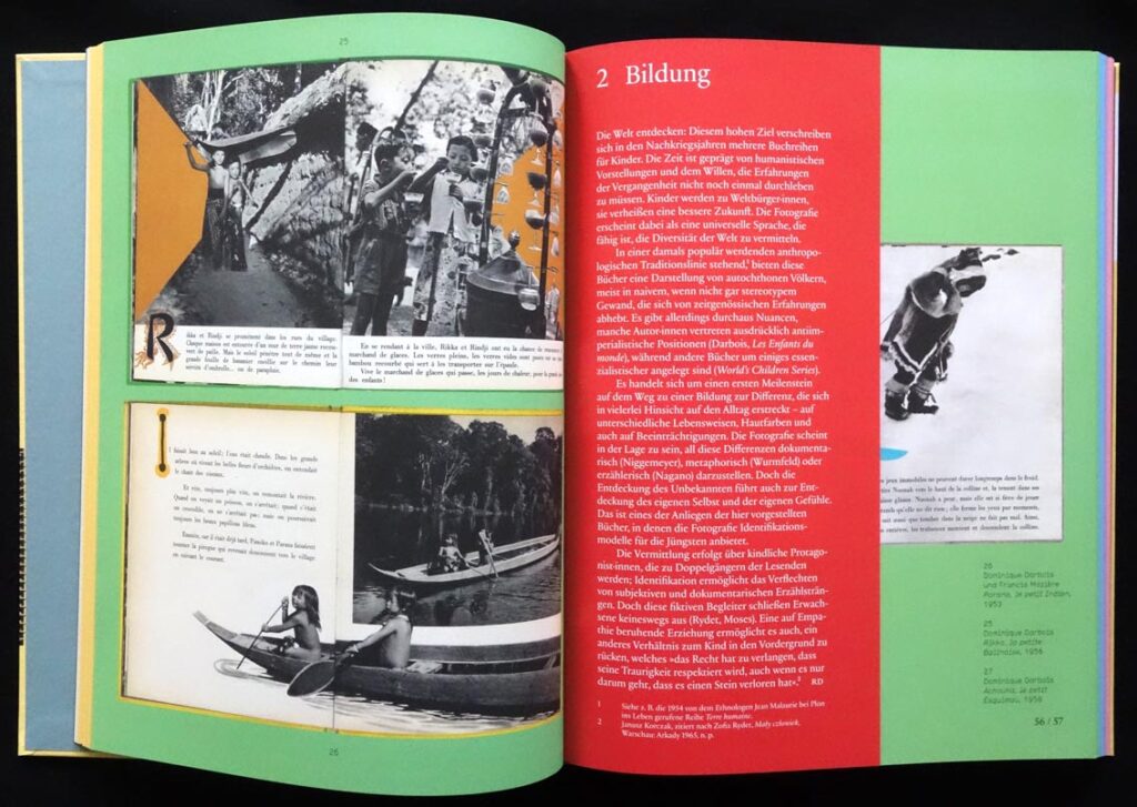 Die ohne Frage bemerkenswerte Gestaltung ist im Stil der Zeit um 1960 mit kräftigen Farben gehalten; jedes Kapitel erhielt eine eigene Farbe, die mit einem unglaublich feinen Raster gedruckt wurde, sodass man auch bei Betrachtung des ebenso farbig gliedernden Buchschnitts denken könnte, dass durchgefärbtes Papier verwendet wurde. Die Kapitelüberschriften lauten: „Neue Erziehungsmethoden und Fotobücher für Kinder“ (gelb), „Bildung“ (grün), „Fiktion“ (blau), „Tiere im Mittelpunkt des Kinder- und Jugendfotobuches“ (violett), „Fotografik“ (rosa), „Zur Kreativität anregen“ (rot), die abschließende Bildbibliografie und die Seiten mit den Essays sind durch einen schwarzen bzw. beigen Farbton gekennzeichnet. Soweit, so sehr gut. Die Brillanz der Reproduktionen leidet ein wenig darunter, vor allem im schwarzen Kapitel am Schluss. Am Anfang ist immer eine halbe Seite mit Text eingebunden, zwischendurch auch (knappe) Erläuterungen zu den 108 einzeln vorgestellten, durchnummerierten Büchern ebenso auf verkürzten Seiten, die zudem duch die Verwendung von glänzendem Papier von dem sonst matten Inhaltspapier geschieden sind. Die Bilder zu den Buchvorstellungen laufen in jedem Kapitel parallel zueinander und dadurch entsteht auf den ersten Blick Verwirrung, aber bei genauerer Betrachtung ergeben sich Vergleichsmöglichkeiten unter den nach konzeptionellen bzw. thematischen Ähnlichkeiten eingruppierten Bänden. Die Umschläge oder Einbände nebst den bibliografischen Grunddaten sind unter den selben Buchnummern allerdings erst im schwarzen Schlussabschnitt zu finden, was gewöhnungsbedürftig ist.