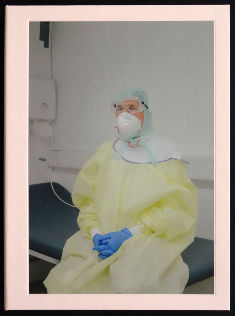 Der Fotograf war 2020 und 2021 in Deutschland unterwegs, um sich Bilder von der Lage der Nation zu machen. Die dabei entstandenen Fotos sind mit einem Grauschleier überzogen so wie die Erinnerung an eine Zeit, die man am liebsten vergessen möchte, es aber nicht kann. Der Reigen mit 58 Stationen beginnt mit einem ökomenischen Gottesdienst, den zwei auf Distanz stehende Pfarrer auf einem überdachten Rednerpult vor geparkten Autos halten und endet mit einer Probe zum „zentralen Staatsakt“ zum Gedenken an die Verstorbenen. Dazwischen sind immer wieder Blicke in Krankenzimmer zu sehen, verstohlene Dokumente von vermutlich damals gar nicht erlaubten distanzlosen Freizeitaktivitäten und selbstverständlich Menschen mit Masken: Politiker, Soldaten, Totengräber. Es wird öffentlich gesungen und vom Fenster aus zugehört. Die Fotos von Demonstrierenden sind trotz schwarzrotweißer Reichsflaggen eher skurril; die Leute wirken harmlos, sind es aber nicht. Aber tagesaktuelle Berichterstattung war nicht die Idee von Nolting, sondern anhand von wirklich starken Einzelbildern die Schilderung einer Stimmung zwischen „Wir schaffen das“ und Resignation.